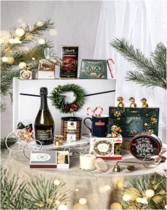 zestaw świąteczny w eleganckim okrągłym pudełku, czekolada, praliny, alkohol, ozdoby świąteczne